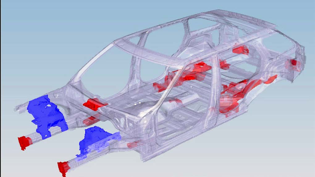 So also must equipment suppliers to JVM, such as Whitehouse Machine Tools. In 2013, the firm supplied an Akari HS-450i 5-axis horizontal machining centre with twin pallet changer, configured as a turnkey production cell to provide extra capacity for machining a specific casting, namely a shock tower (shaded blue in the image below) that links the chassis and suspension in Jaguar saloon cars.