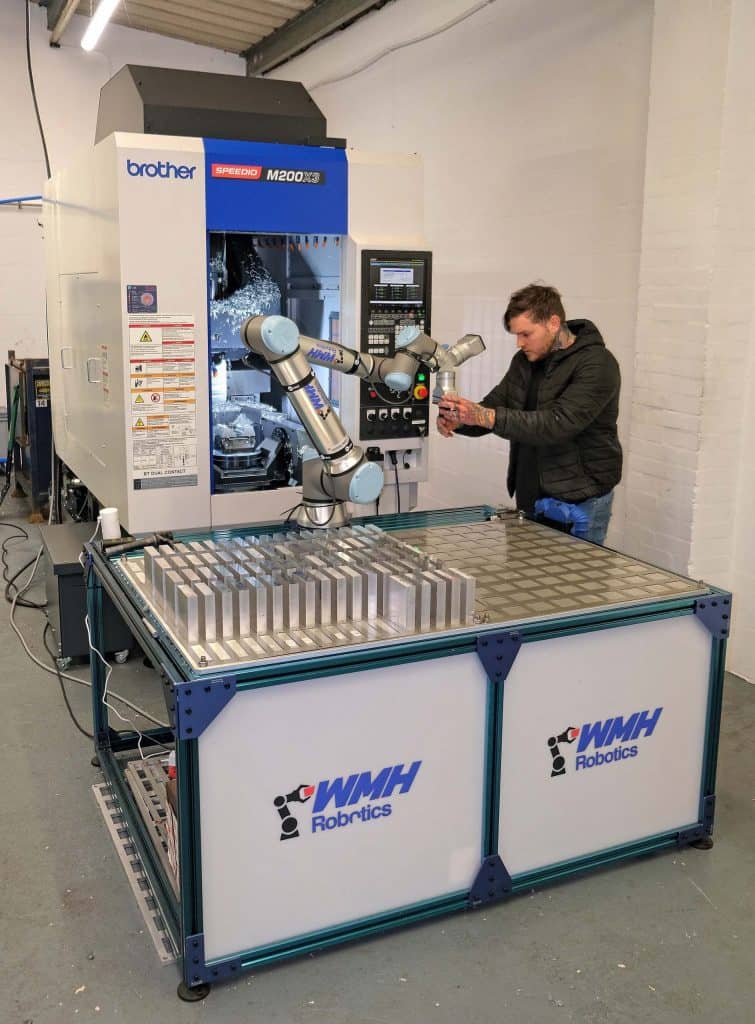 During machine installation, Whitehouse integrated a Universal Robot cobot that had previously been purchased through WMH Robotics together with a workpiece stocker table. The equipment enables components requiring two operations, such as pedals, to emerge from the production cell completely machined after having been inverted following op 1 and placed back in the fixture. Initially, blanks are picked up individually from one side of the table in front of the machine and finish-machined parts are returned to the other side.