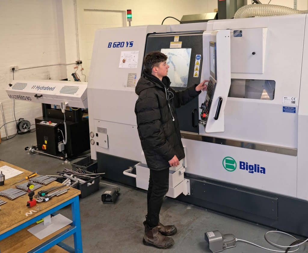 The lathe was installed in Newtown in February 2022, prior to which production of about 20 rotational parts was subcontracted out locally and pedal axles were bought in from overseas. A couple of other potential lathe suppliers were considered before the decision was made to purchase the Biglia. However, the specification of the Italian lathe, with its 30kW/15kW main/counter spindles and box ways in X and Z (with a linear guideway in Z for speed) clinched the deal.