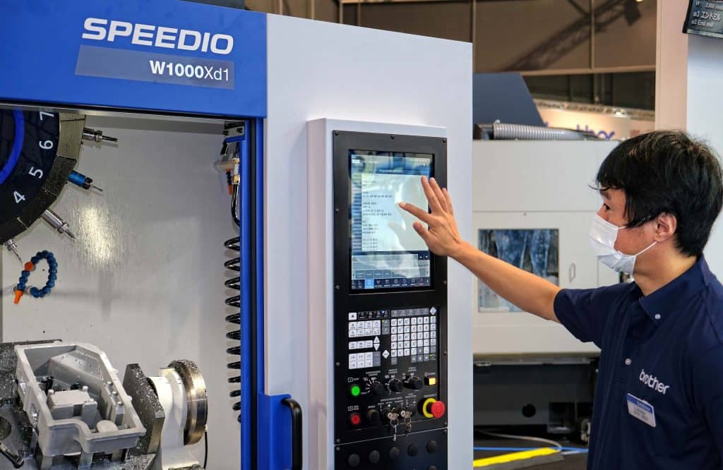 The W1000Xd1 is the first machine from Brother to have an LCD touchscreen control. It has a 15-inch screen that offers enhanced usability, extracting higher productivity from the machine compared with the earlier Brother ISO CNC system, the C00. Energy-efficient hybrid drive motors have been used and the faster acceleration and deceleration of the low inertia spindle motor, which harnesses interior permanent magnet technology, has cut tool-to-tool time by 25% to 0.6 sec. It reduces cut-to-cut time from 1.4 to 1.2 sec, shortening cycle by between 3% and 9% depending on workpiece size and complexity.