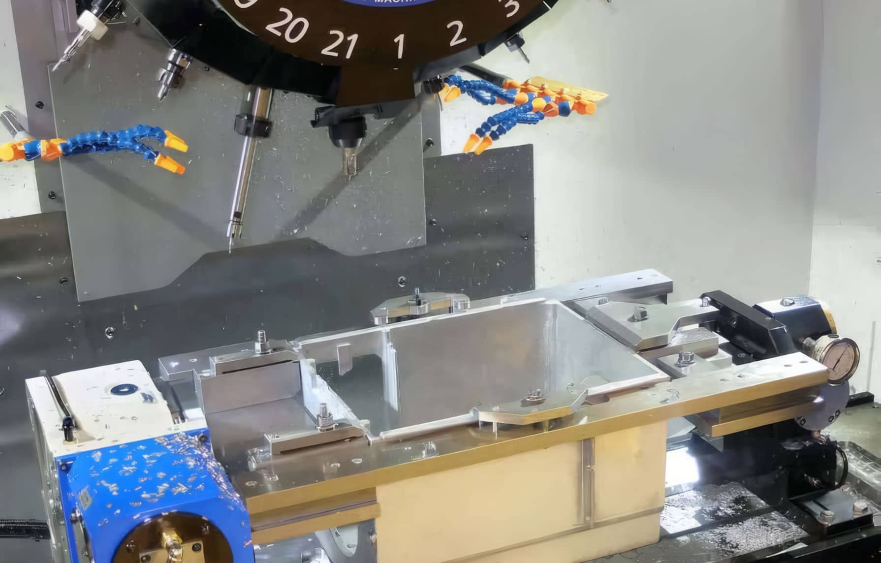 “First, we had a 150 mm column riser fitted to both machines so that we can swing a 550 mm part on a trunnion arrangement comprising a rotary table and tailstock. By using a bridge style fixture with pockets in the fixture plate, the fourth CNC axis allows machining to be completed on four faces of a casting in a single operation.