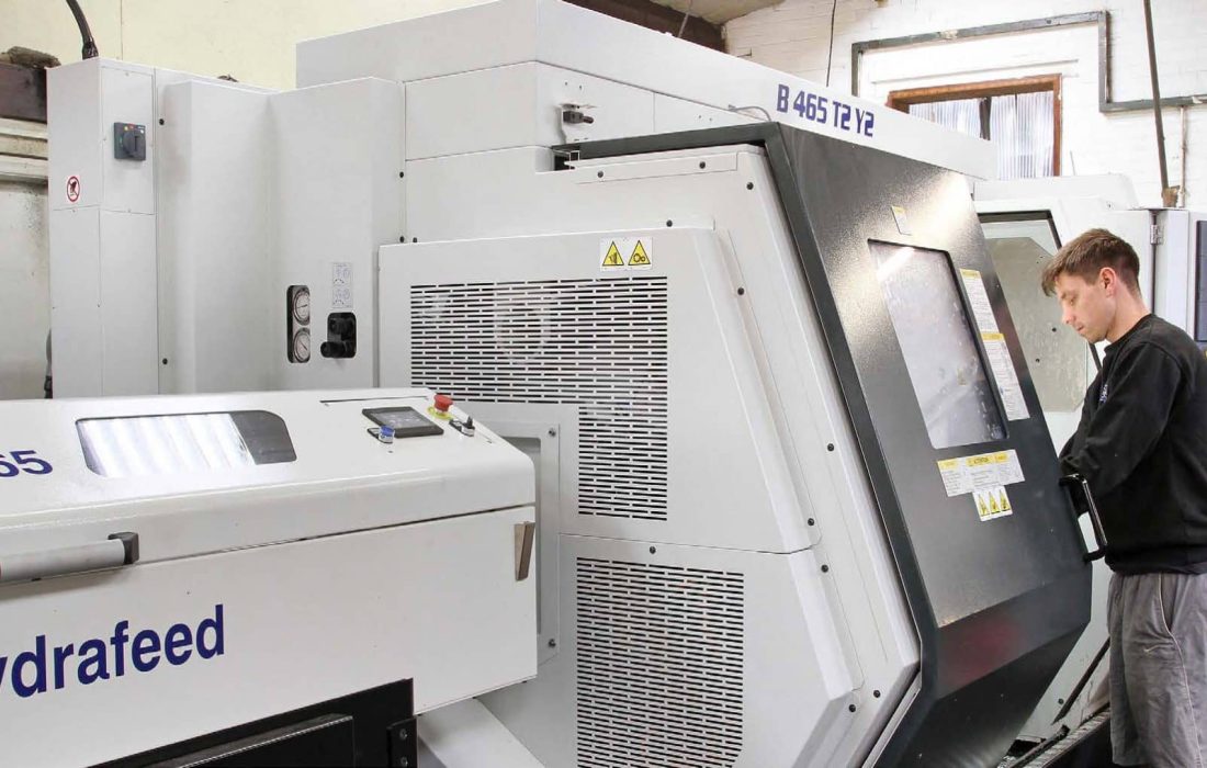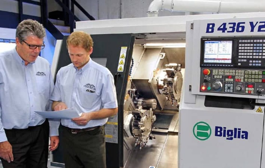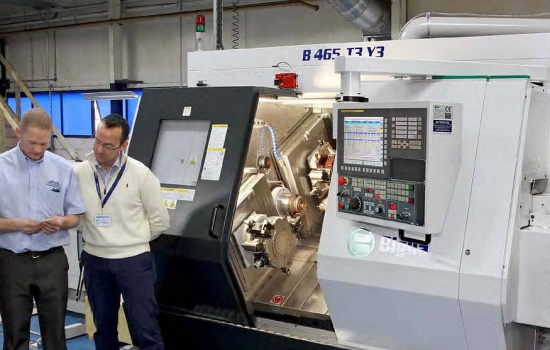 At the Hailsham, East Sussex factory of subcontract machinists, Dicker Precision Components, an Italian built Biglia twin-turret, twin spindle CNC turning centre supplied by Whiteh...