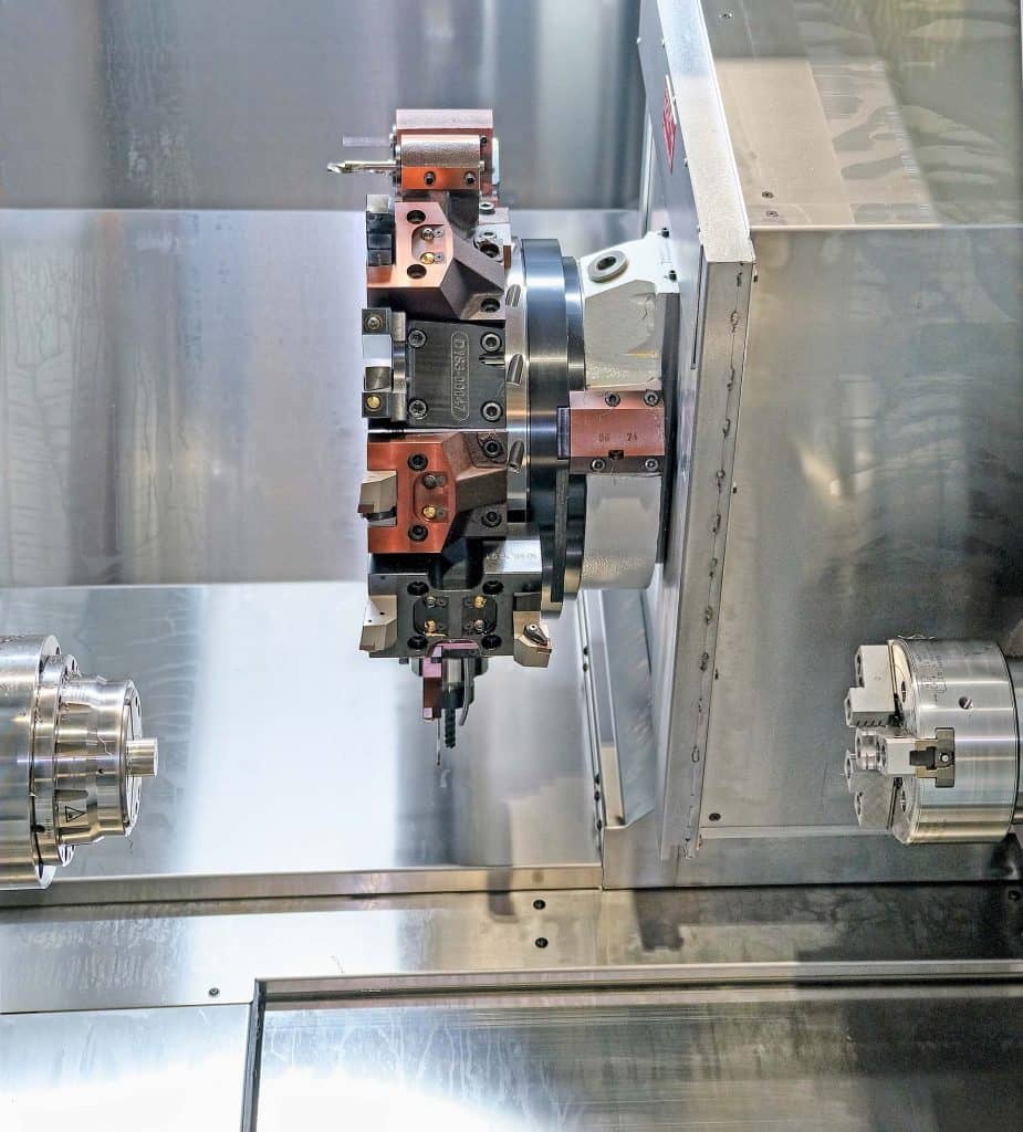 He was told that the latest design of this 6.5-tonne machine incorporates a massive, cast iron machine bed that has been reinforced by 20% compared with the model it superseded. It is notable that to promote rigidity and accurate machining, the lathe has box ways in the X and Y axes, with a linear guide rail in the Z-axis for speed of traverse.