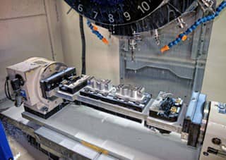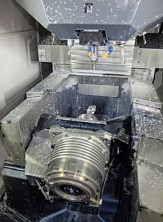 Another view of the Speedio M140X2, showing a master cylinder being machined from an aluminium billet. The A-axis trunnion rotates from +120 to -30 degrees, allowing machining of features at the rear of components and facilitating loading and unloading of parts at the front of the machine.