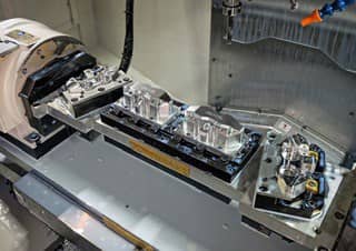 The S700X1 machines are currently devoted to producing either ‘100’ or ‘108’ caliper sets in two operations using bespoke, 4-station fixtures on either side of a trunnion, so two complete components come off each machine every time the doors open. In the M140X2, one master cylinder is produced in two operations in a total cycle time of one hour.