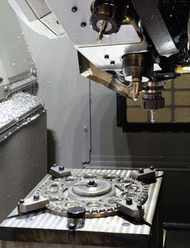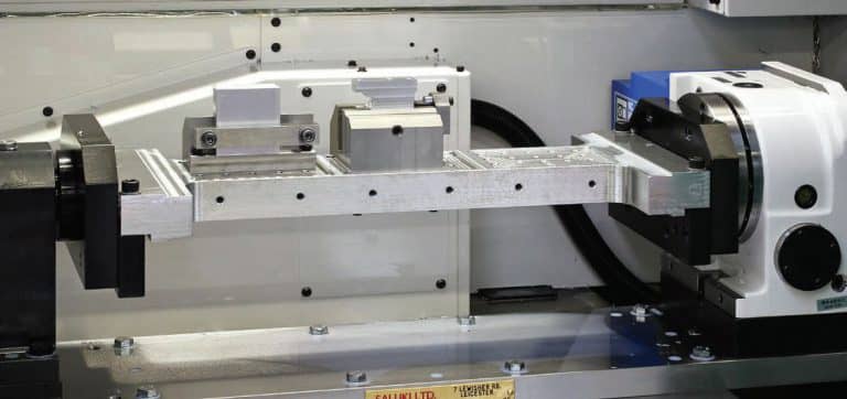 On one pallet is a Kitagawa 2-axis table that gives 5-axis functionality, while on the other pallet, a Kitagawa trunnion provides one additional CNC axis.